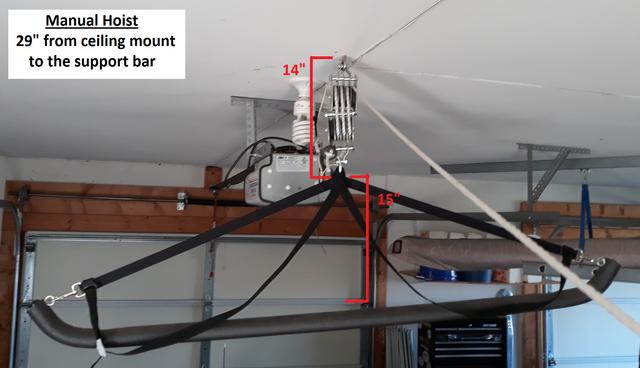 A: Ideally, your garage ceiling should be between 8 and 12 feet for the manual hoist and between 8 and 20 feet for the electric hoist. Any lower and you'll have to pull your car forward to raise your soft-top after hardtop removal. Garage ceilings under 7' 4" won't be compatible with our system. In the case of the electric hoist, 12 feet or higher will require the wireless controller since the standard motor doesn't come with a long enough cord.